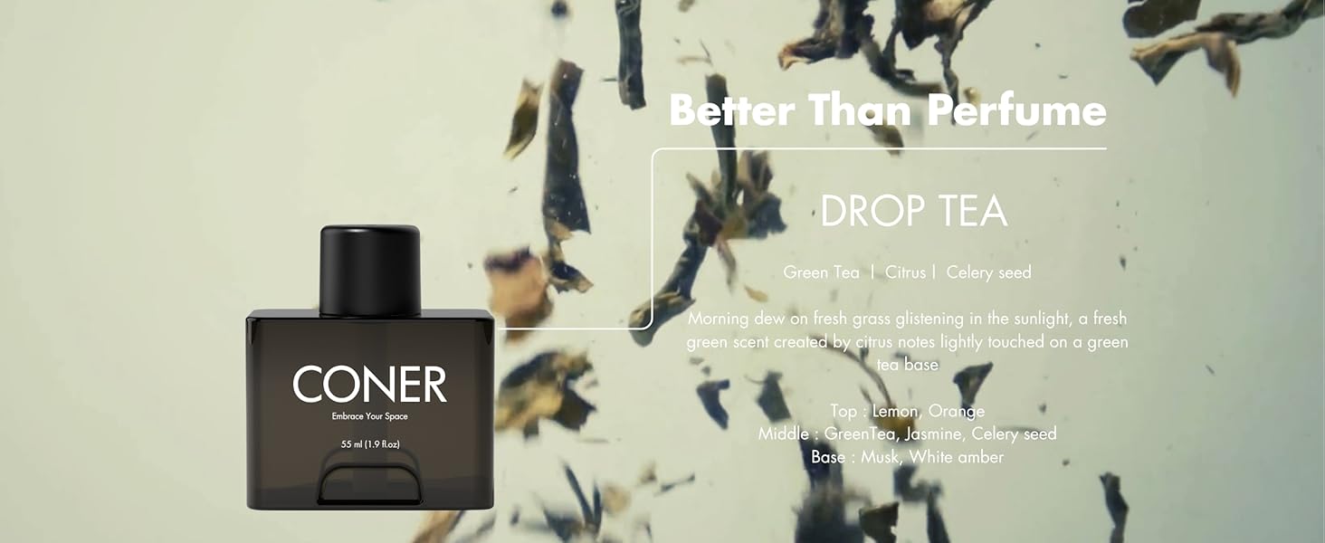 • CONER Drop tea Fragrance Note : Morning dew on fresh grass glistening in the sunlight, a fresh green scent created by citrus notes lightly touched on a green tea base