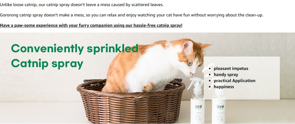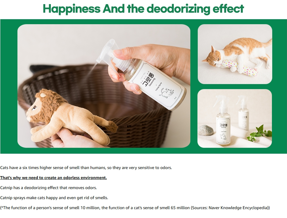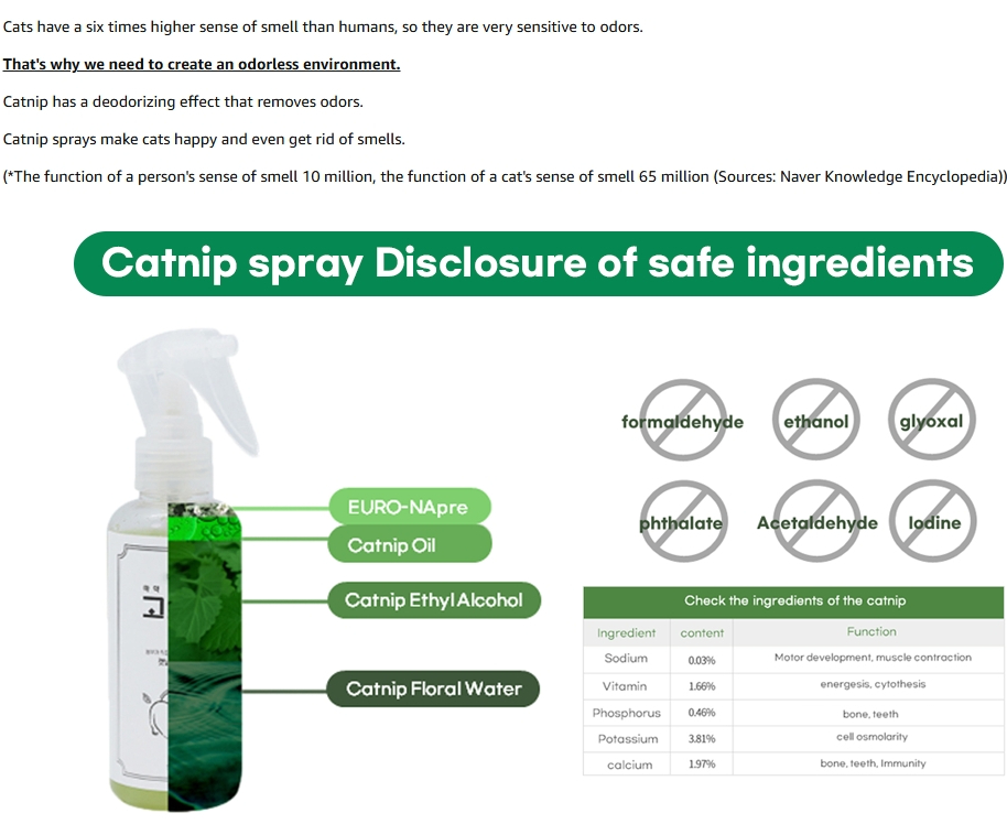 🌿 NATURAL CATNIP SPRAY: Our catnip spray is made with premium and organically grown catnip, hand-harvested in South Korea. We only use safe ingredients with no harmful synthetic additives, ensuring that our strong catnip spray captures your cat’s attention and entices them to play.