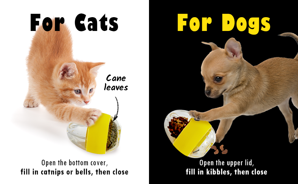Experience an engaging and rewarding playtime. Fill our cat & dog food dispensing toy with your pet’s favorite treats and watch the treats pop out as it rolls.