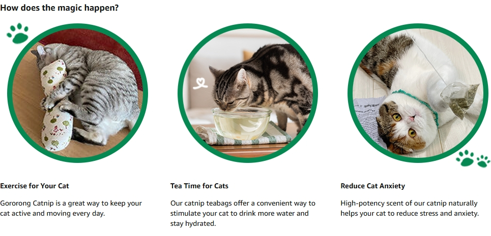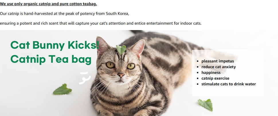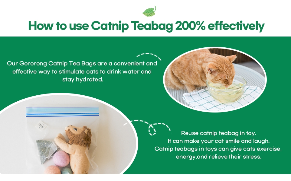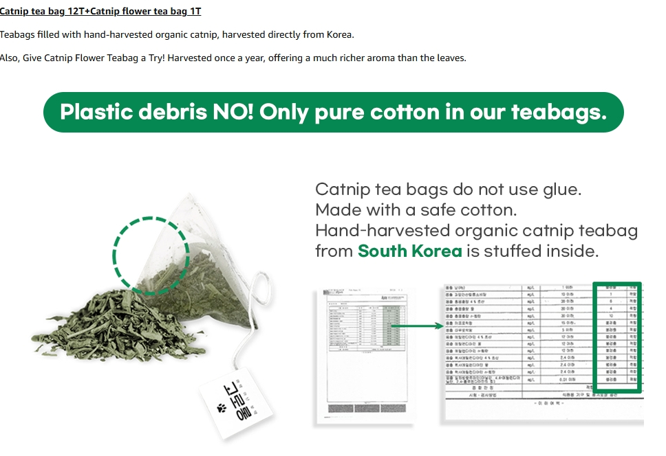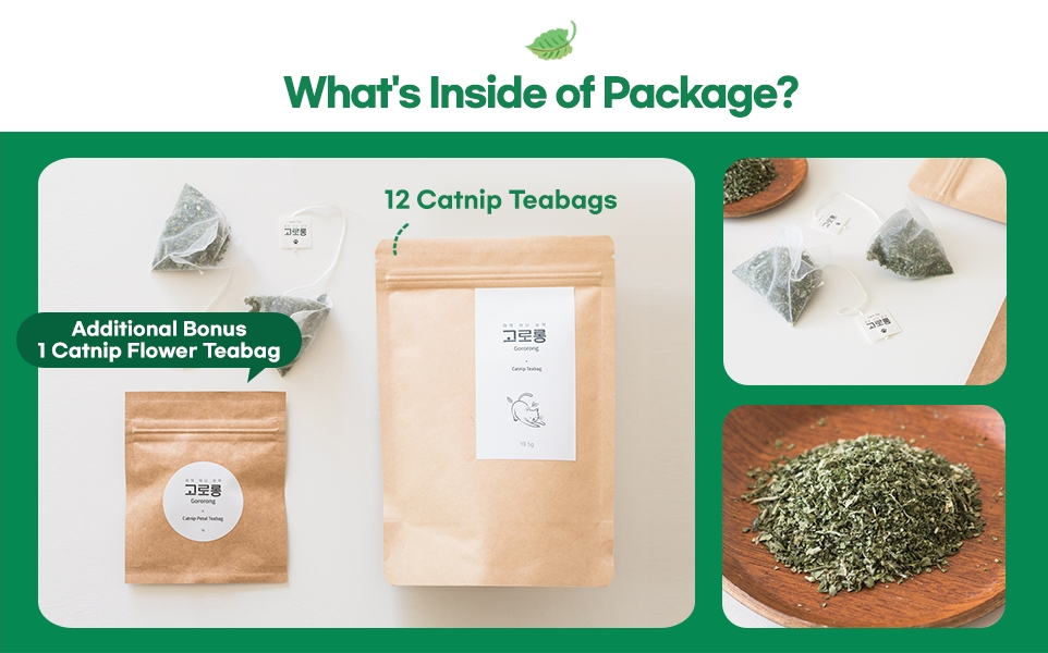 • Natural catnip: Gororong Catnip Teabag contains only natural catnip and pure cotton in teabags. Hand-harvested catnip from South Korea ensures a potent and rich scent